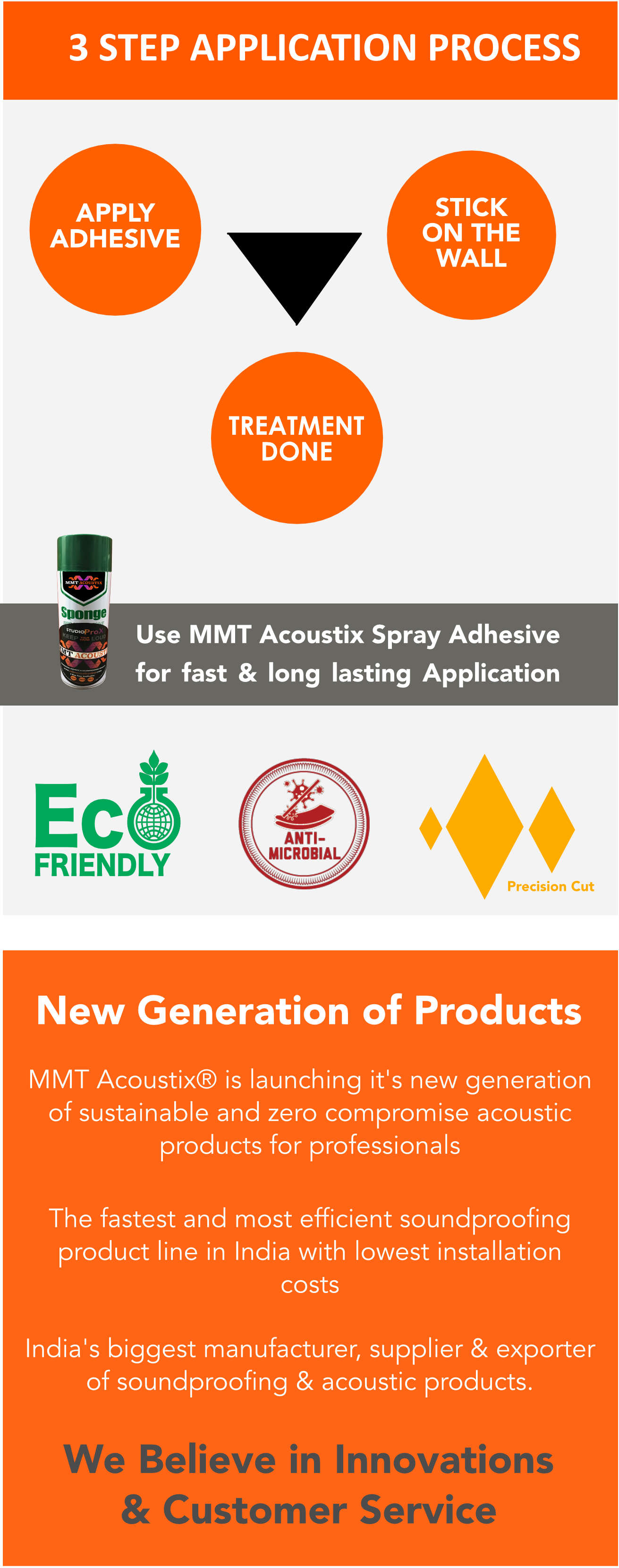 Unlike other sound absorbing & soundproofing materials in the market, MMT Acoustix® Acoustic foam panels are highly effective, tested, certified by government institutes ( ARAI, TüV ), cost effective, easy to install, DIY, indigenous ( Proudly made in India ) and can be installed on any type of surface.
