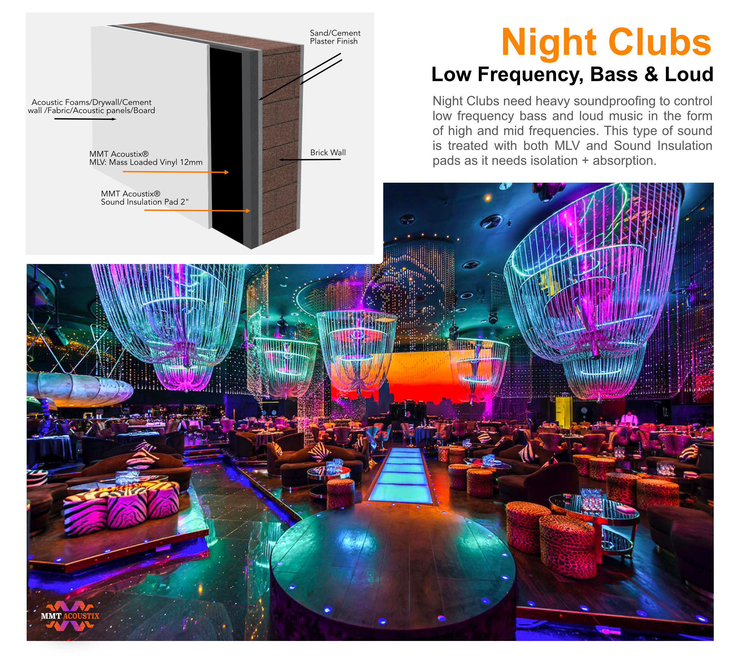 Soundproofing and acoustic treatment in nightclubs, bars and discotheques are very important and enforced by government laws too. MMT Acoustix® manufactures soundproofing membrane like SoundBlanket, Bass Absorbers like BassBloc® and high, mid frequency absorbers like Sound Insulation Pads for treating such entertainment spaces.