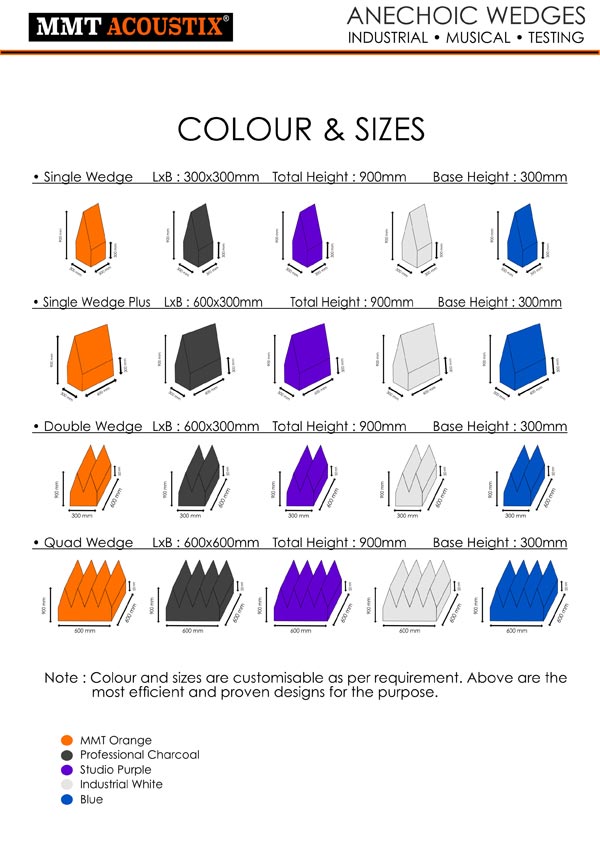 MMT Acoustix manufactures medium/high density acoustic polyurethane anechoic wedges for maximum sound diffusion and absorption. The wedges are designed to diffuse and absorb sound at the same time. The depth and thickness of the wedges are maximized to achieve 20-30 DB sound levels. MMT Acoustix Anechoic Wedges are available in various sizes and colours as per client's requirement.